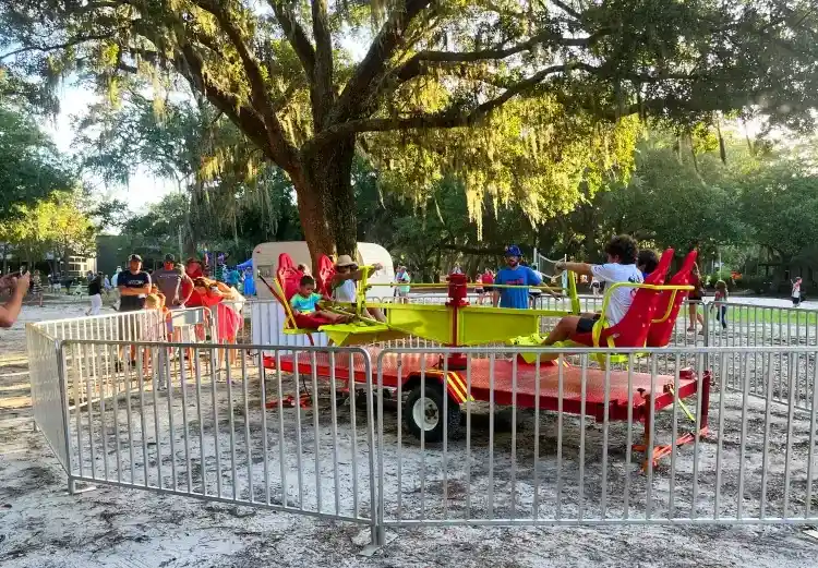 Our Charleston Cyclone Ride is the perfect amusement attraction for your event! This four person carnival ride accommodates adults and most children . Since this portable ride rental is powered by “human power” and requires no electicity, this carnival ride rental can be set up virtually anywhere.